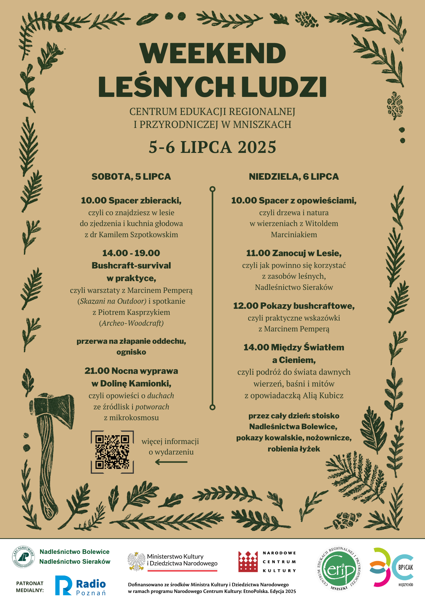Weekend Leśnych Ludzi5-6 lipca 2025Centrum Edukacji Regionalnej i Przyrodniczej w Mniszkach W pierwszy weekend lipca zapraszamy Was do Mniszek, gdzie spotkają się miłośnicy przyrody, dawnych wierzeń, dzikiej kuchni, bushcraftu i tradycyjnego rzemiosła.„Weekend Leśnych Ludzi” to wydarzenie pełne wiedzy, praktycznych umiejętności i niezwykłych opowieści – dla pasjonatów outdooru, survivalu i tych, którzy po prostu pragną odpocząć … Czytaj dalej Weekend Leśnych Ludzi